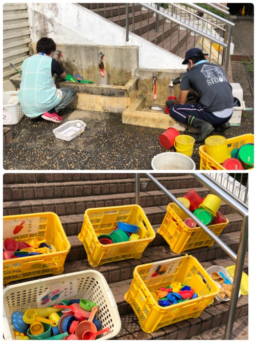 みんなが楽しく遊べるように砂場のおもちゃをきれいに洗ったり、お部屋をお掃除したり、運動会の準備をしたりして、みんなに会えるのを楽しみにしています。