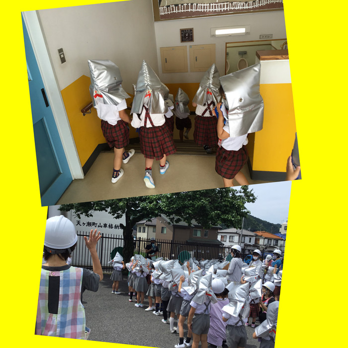 机の下にかくれ、揺れが収まるのをまったら防災頭巾をかぶり外園庭まで避難します。