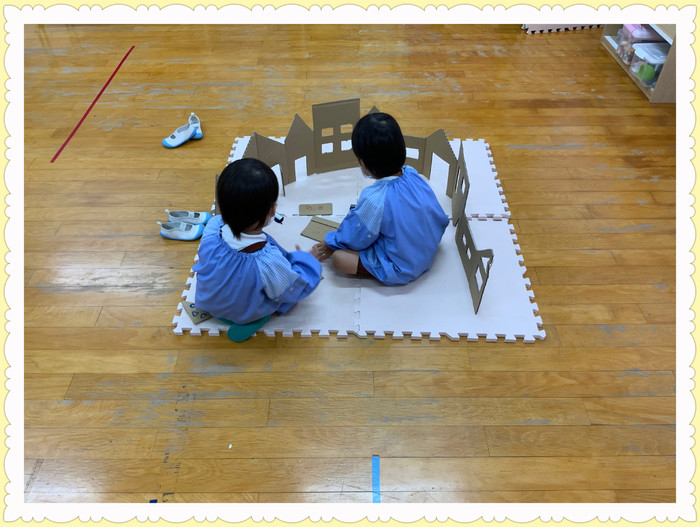 今日は何を作っているのかなぁ?とパンダクラブを覗いてみると、ダンボールを使って建物を作っていました。