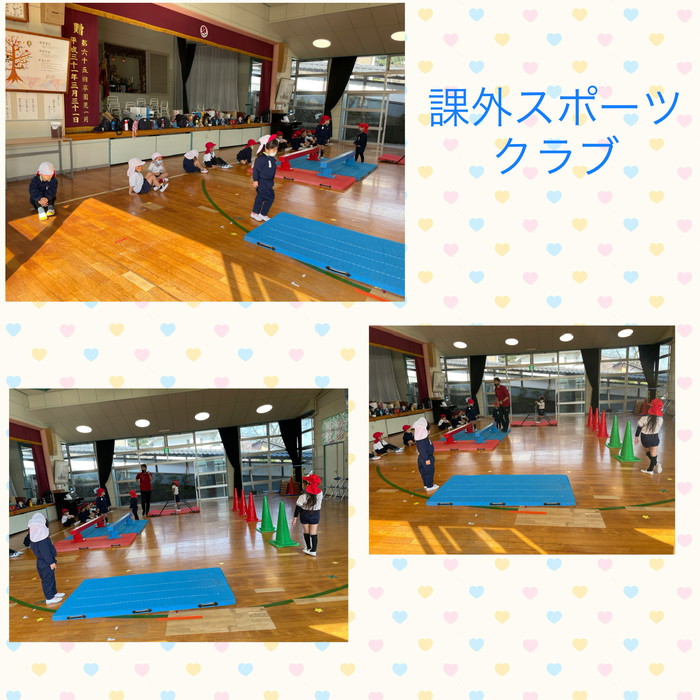 課外スポーツクラブではパワーテストの真っ最中でした。目隠しして片足立ちで何秒立てるかな?運動の基本、両足跳びも飛距離を測定してもらってました!
