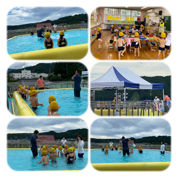 大江さんがすみれ組のプールを準備してくれていたら年長さん達が大集合!興味津々です
