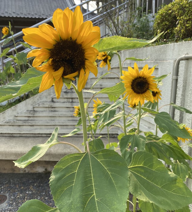 幼稚園では運転手さんが植えてくれたひまわりが花を咲かせました? ?