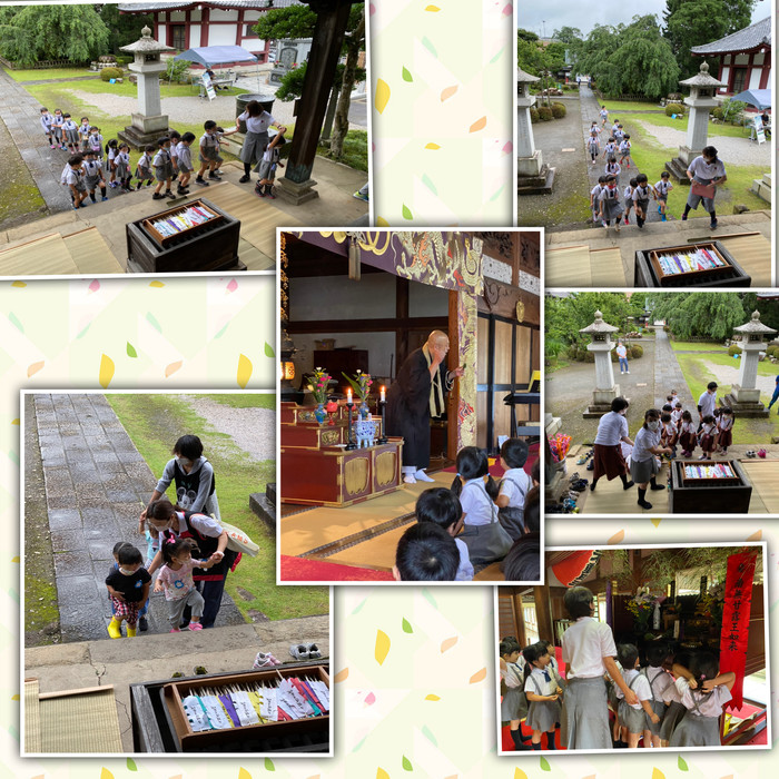 在園児のおにいさんおねえさんは15日にお盆の集いで本堂に行き、住職から盂蘭盆会(うらぼんえ)のお話を聞くのですが、その日は水曜日なので月木だけ来ているのお友だちは参加できません。