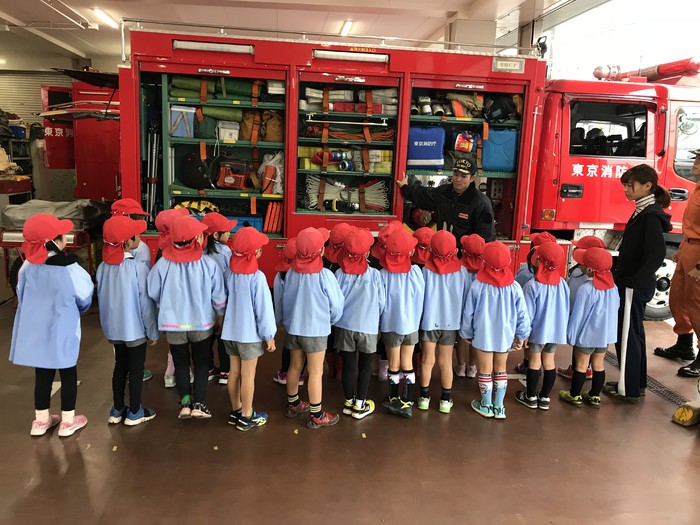 勤労感謝の日が近いので、年長組のみんなは青梅消防署に感謝の気持ちを伝えにいきました。