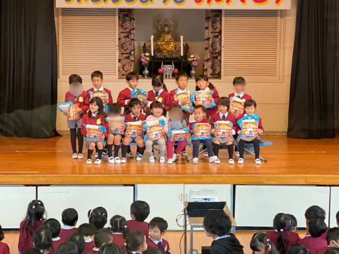 年中さんたちはいつもおいしいお弁当を届けてくれるシントミフーズさんと体育指導をしてくれる福山先生へプレゼントを渡しました。