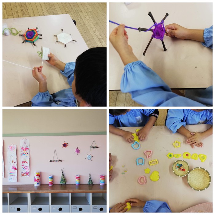 遠藤先生が木の枝や自然なものを見つけて来ては、先生たちもアッと驚くようなものを子どもたちと一緒に作品に変身させてくれます。