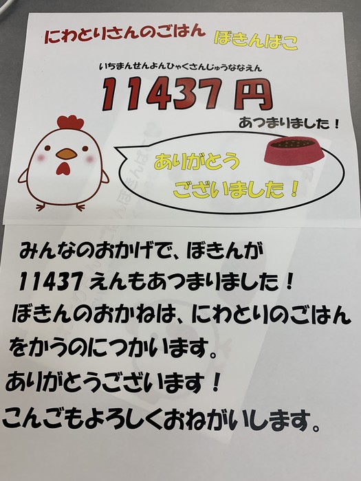 皆さんのにわとりさんたちへのお気持ち、にわとりのエサ募金を開封しました。11437円も入っていて驚きました。本当にありがとうございます。