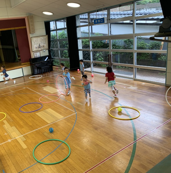 みんな大はしゃぎでフープやボールやバトミントンで遊んでました