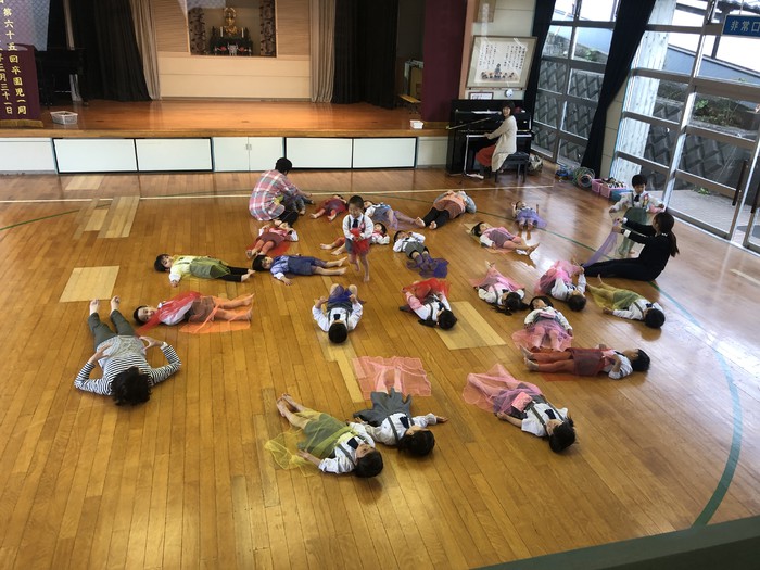 ピアノの音に合わせてスカーフでおばけになったり、2人組で汽車になったり、大きな声でうたを歌いながらとーっても楽しそうに体を動かしてます?