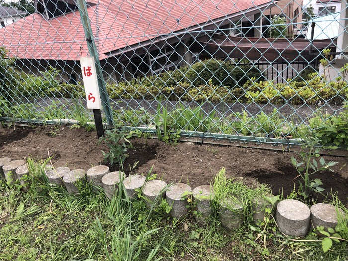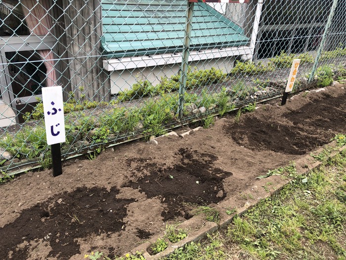 美味しい がたくさんなりますように!との願いを込めながら小さなおててで野菜の苗を植えました。