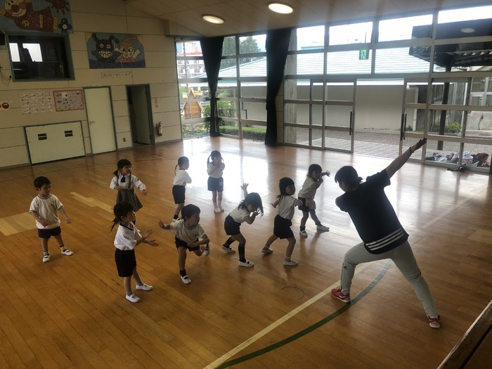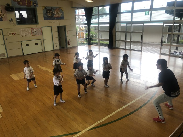 指先にも意識を向けて、前にならえでは前のお友だちにぶつからないようにしっかりと手を前に出すこと、両手間隔に開くときはお隣のお友だちとの距離が取れること、先頭のお友だちは後ろに続くみんなの基準となるように手を腰にブレないで立つことなどを学んでます。